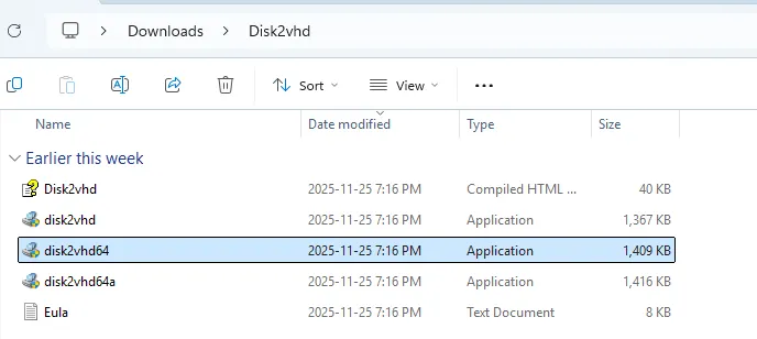 After downloading, extract the ZIP folder and run the appropriate executable for your system, in my case I ran Disk2vhd64.exe