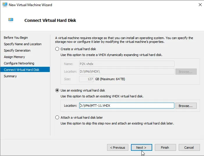 In Hyper-V, create a new virtual machine as usual. In t he Connect Virtual Hard Disk window select Use an existing virtual hard disk and then choose the VHDX file you created in step 2.