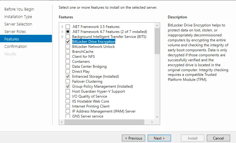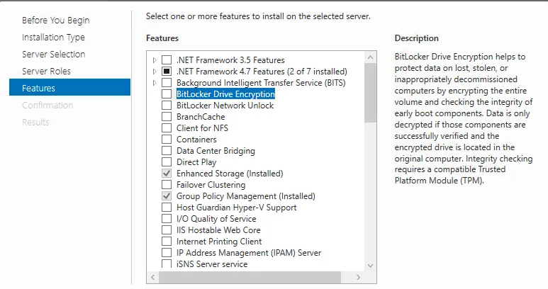 1. Add the BitLocker Drive Encryption Feature