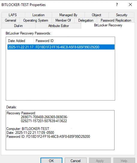 You should now see the recovery key stored in AD.