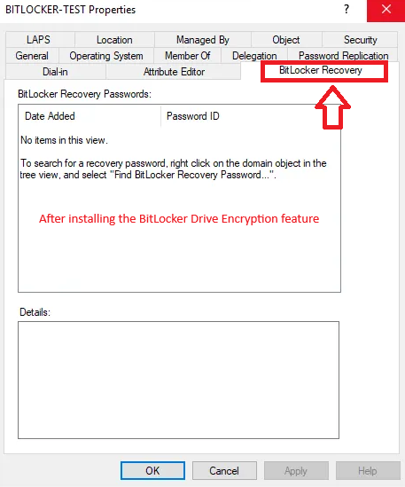 After installation, AD will display a BitLocker Recovery tab inside each computer object where the recovery keys will be stored.