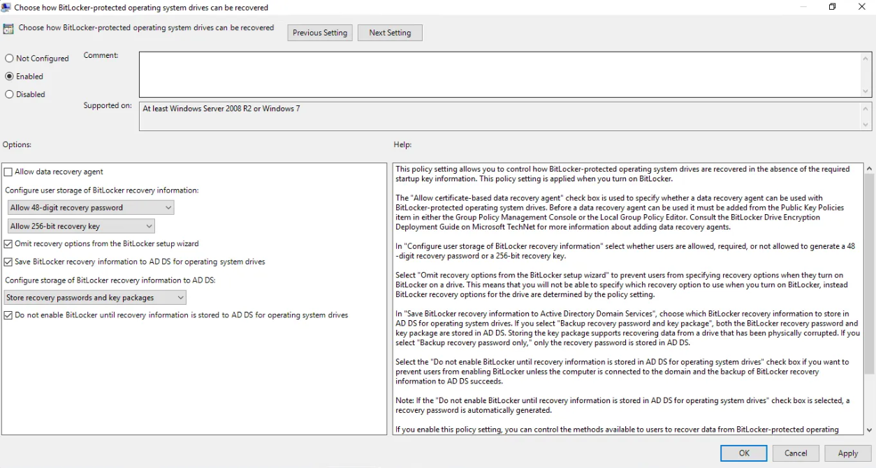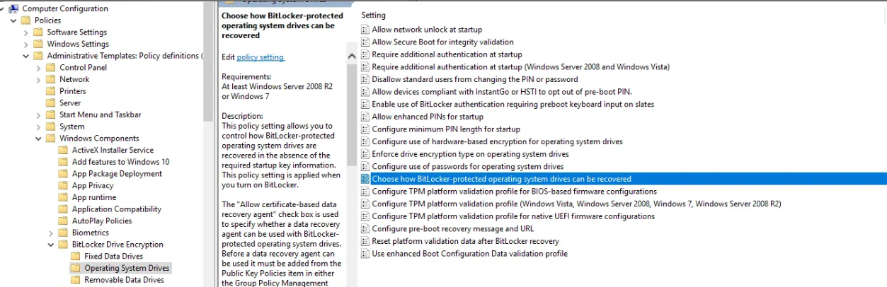 Operating System Drives > Choose how BitLocker-protected operating system drives can be recovered - Set the policy to Enabled, then configure the following options: